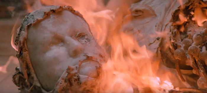 Но вернёмся к съемкам. Для сцены с оторванной головой слепили макет головы Эша из латекса — одна беда, из-за печального качества материалов, она скукожилась во время сушки. Это несовершенство было заметно уже тогда, но из-за нехватки времени, ограниченного бюджета и поджимающих сроков, решили оставить как есть. Один фиг её сжигать.