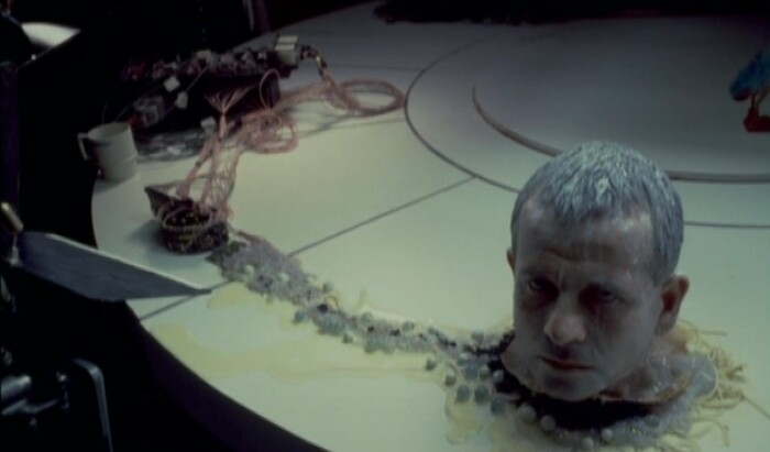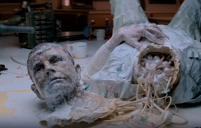 — «Мы видим, — рассказывает Ридли, — Иэна через отверстие в столе. В луже молока, икры, макарон и стеклянных шариков. Стеклянные шарики просто отличная находка. Это как бы его память. Бедный Иэн, он ненавидел молоко, а в каждом дубле я наливал ему его в рот. И он начинал говорить. Потом мы немного изменили голос, придали как бы вспенивание».