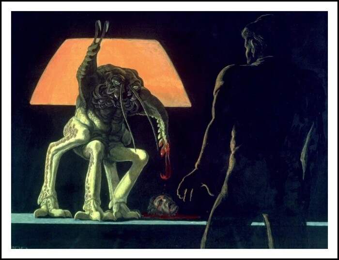 Вскоре по заказу Ридли Гигер представил свою версию, вдохновившись творчеством Фрэнсиса Бэкона – правда, результат ему не понравился. Но лично мне видится схожесть с уродом из «Нечто».