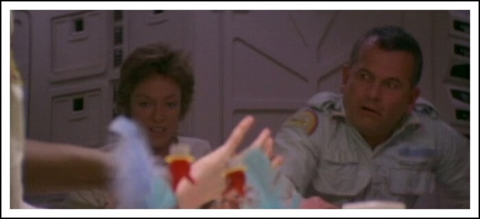 По словам Вероники Картрайт, было снято две версии сцены: первая была по изначальному сценарию (много пояснений сюжета), а вторая включала диалог в том виде, в котором мы его знаем. Пересняли только сцены с Холмом, а реакцию команды перенесли с первых съёмок.