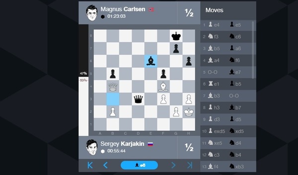 1.d4 d5 2.с4 dc 3.е3 е5 4.С:с4 ed 5.ed Кc6 6.Се3 Cd6 7.Кс3 Kf6 8.Kf3 0—0 9.0—0 Cg4 10.h3 Cf5 11.Kh4 Фd7 12.Фf3 Ke7 13.g4 Cg6 14.Лае1 Kph8 15.Cg5 Keg8 16.Kg2 Лае8 17.Се3 Сb4 18.а3 С:с3 19.bc Ce5 .20.Фg3 с6 21.f3 Cd5 22.Cd3 b5 23.Фh4 g6 24.Kf4 Cc4 25.С:c4 bc 26.Cd2 Л:e1 27.Л:e1 Kd5 28.g5 Фd6 29.К:d5 cd 30.Cf4 Фd8 31.Ce5+ f6 32.gf К:f6 33.С:f6+ Л:f6 34.Ле8+ Ф:e8 35.Ф:f6+ Kpg8. Ничья.