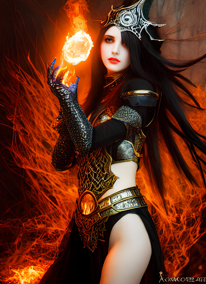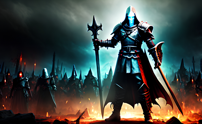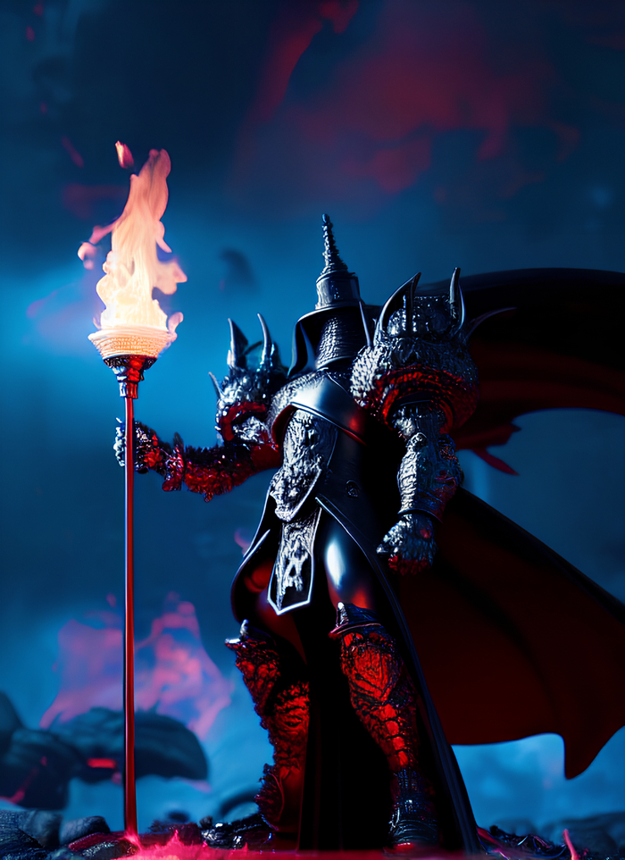 Промт: a grim Dark Overlord poses in fire and cast a spell, full body art, ornate full plate armor, closed ornate crown-helm with eye slits, flames everywhere, highly detailed, digital painting, masterpiece, dark fantasy, artstation, unreal engine 5, ambient light, sharp focus, Yoshitaka Amano, greg rutkowski