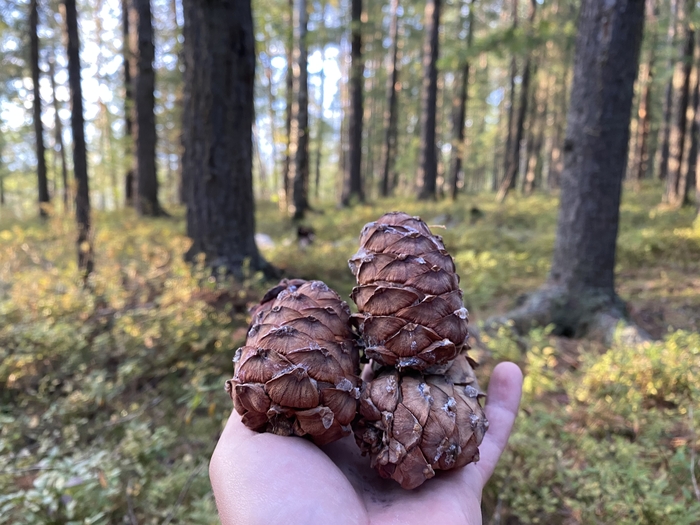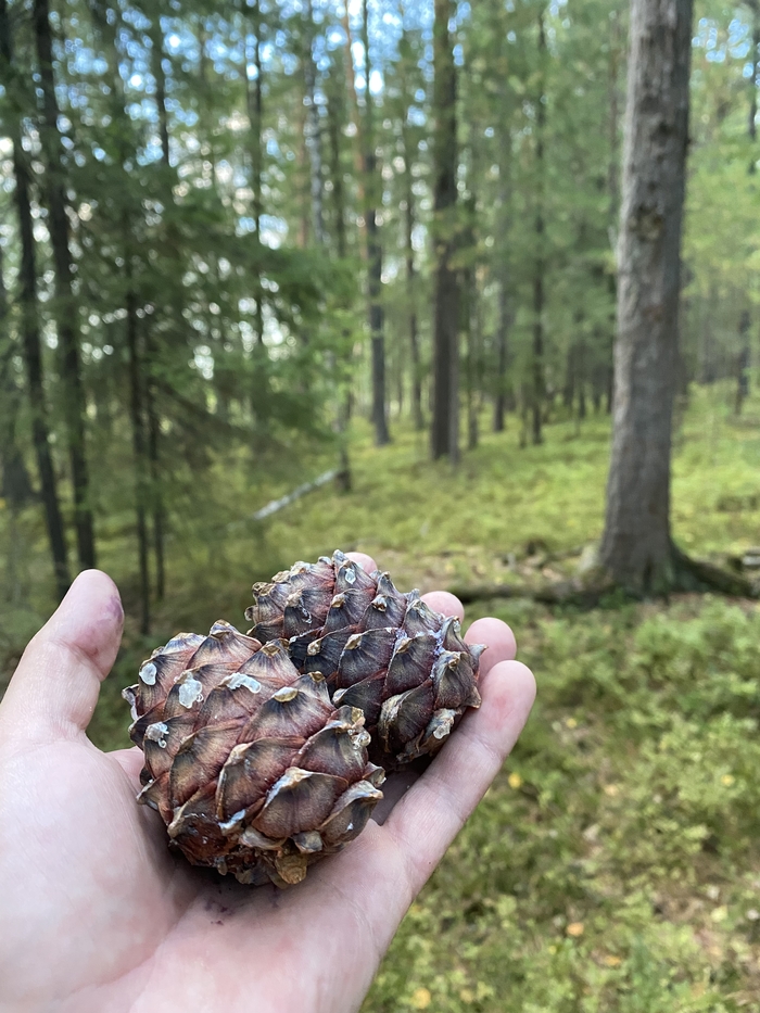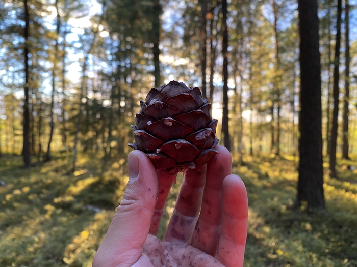 В итоге набрал шишек и наелся чернички, а грибов я больше так и не видел. Это все потому, что взял нож. Орехи свежие очень вкусные.