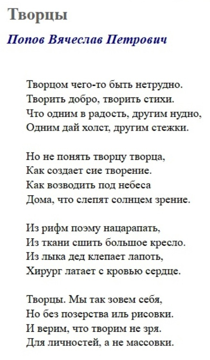 За свою жизнь я сталкивался со многими людьми. Школа, университет, работа. На каждом этапе встречались разные люди, но почти у каждого было свое хобби. Кто-то любил играть в компьютерные игры, смотреть фильмы, занимался футболом или увлекался автомобилями. Да, хобби есть у многих, но не у всех хобби творческое. Ведь для этого мало пользоваться, а нужно ещё и что-то создавать. Конечно, можно любить играть в игры и заниматься стримингом, превращая свое хобби в заработок. Но будет ли это творчеством? Наверное, это зависит от того, как именно будет происходить такая деятельность. К примеру, многие видеоблогеры создают очень качественные видеоролики (вспомним к примеру Badcomedian), которые тратят на свой труд много времени и сил, а людям дарят качественный продукт. Такое занятие также можно считать настоящим творчеством. Такие люди всегда вдохновляли меня, и я посвящал всем творцам особое стихотворение.