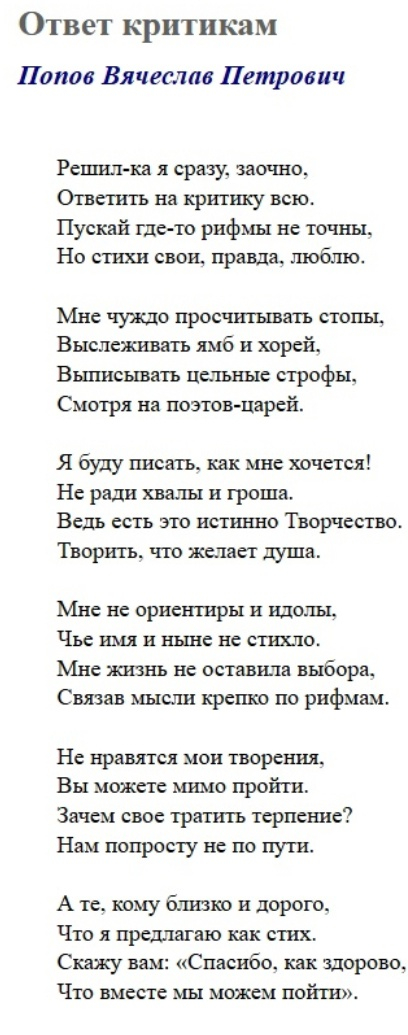 Я же для критиков посвятил отдельное стихотворение, добавив его в свой сборник сразу после вступления, в котором, как я думаю, заранее постарался ответить на их возможные претензии:)
