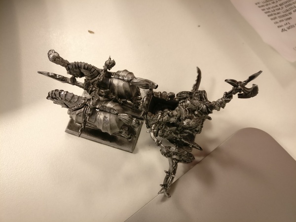 Ни одно нормальное животное не обладает достаточной силой, чтобы тащить такую громадину. Колесницы Хаоса ведомы гигантскими дестриерами, разросшимися до сверхъестественного размера в те же искусно сделанные латы, как и их хозяева. Когда эти грозные создания набирают скорость, их глазницы и ноздри пылают колдовским огнём, создавая впечатление, что колесница прорвалась в реальность прямо из мира кошмаров.