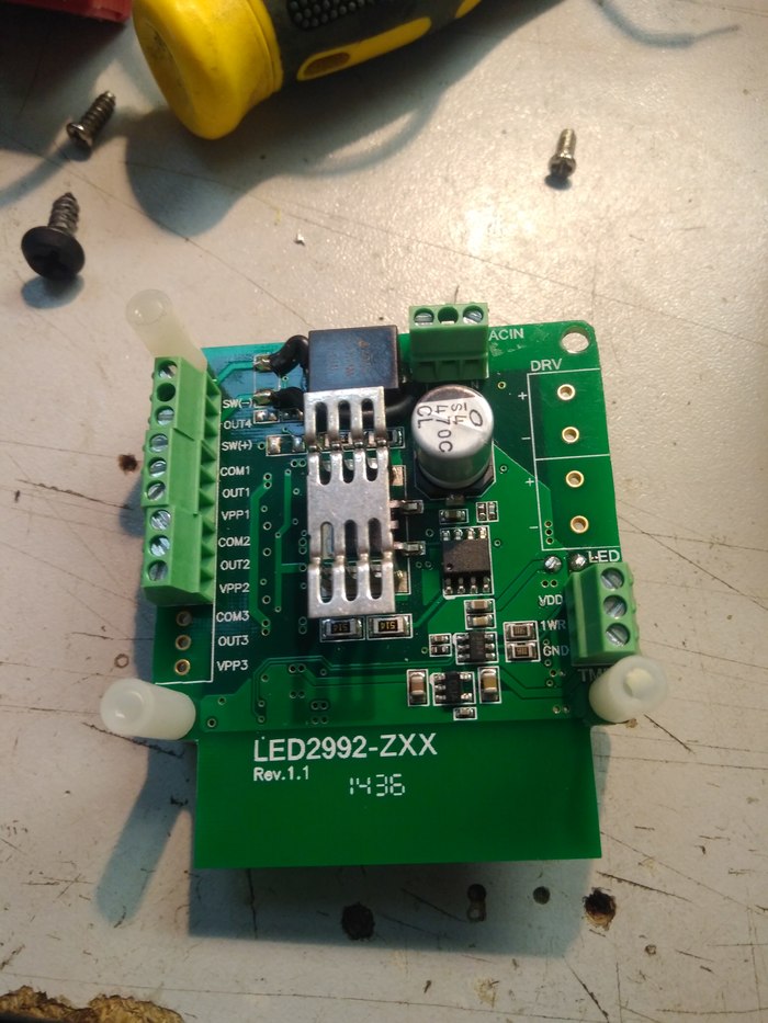 Вообщем разобрал, проверил БП, с ним норма, соединил на прямую БП с диодами - работает. Но. Изначально, питание диодов шло через этот модуль. Инфы по номеру на плате, в интернете не нашел. Что это может быть? Насколько я понимаю, возможно это приемник ДУ?