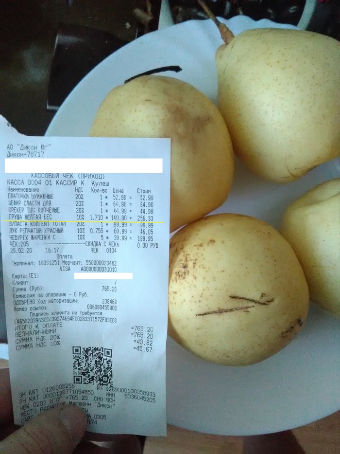 Решил сходить в Дикси и купить китайских груш (да и прочих вкуснях). На кассе кассир уточнил "Это жёлтые груши по 149.90?". Я в недоумении сказал "Китайские вроде". Месяц назад брал - ещё по-старому назывались. Кассир сбегала в зал, посмотрела на полке, вернулась и сказала "Да, жёлтые."