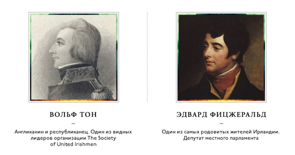 Разумеется, ирландцы только и ждали удобного момента, чтобы восстать, хотя в конце XVIII века некоторая часть ограничений была отменена. В прошлый раз они пытались воспользоваться двумя гражданскими войнами в Англии. В этот раз удачной возможностью выглядели Революционные войны на континенте. Французская революция 1789 года породила целую волну всевозможных войн, и бойня потом практически не прекращалась следующие четверть века. Воспользовавшись тем, что англичане отвлеклись, а также заручившись поддержкой революционной Франции, ирландцы в 1798 году вновь устроили мятеж. В отличие от предыдущих восстаний за смягчение религиозной политики и прекращение дискриминации это было вдохновлено примером американской и французской революций: конечная цель — независимая республика Ирландия. Как это часто бывает, от имени угнетенных стали говорить люди, представлявшие себе угнетение в основном по книжкам. За восстанием стояла организация The Society of United Irishmen. На первом собрании этой революционной ячейки выяснилось, что все её лидеры — протестанты, либо пресвитериане, либо англикане. Самым видным из них был Вольф Тон — англиканин и республиканец. Позднее к Обществу объединенных ирландцев примкнул один из самых родовитых жителей острова, депутат парламента лорд Эдвард Фицджеральд. Достаточно сказать, что его отец был единственным на тот момент ирландским герцогом. Двоюродным братом Фицджеральда был легендарный Чарльз Джеймс Фокс — знаменитый «вечный оппозиционер» и лидер вигов-радикалов, успевший недолго побыть министром иностранных дел Британии.