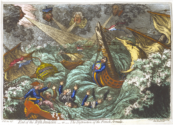 «Объединенные ирландцы» решили заручиться поддержкой французов, которые тогда как раз воевали с англичанами. Англичане, к слову, не оставались в стороне и поддерживали бежавших из Франции роялистов. В Париж был послан Вольф Тон, и он встретился с рядом французских военачальников, включая и Наполеона. Французы согласились помочь, отправив 15-тысячный отряд Лазара Гоша. Однако погода стояла настолько отвратительная, что французы то попадали в бурю, то тонули, и в итоге флот заблудился, рассеялся и распался. Уцелевшие корабли поодиночке стали возвращаться обратно. Англичане так хохотали, что даже увековечили неудавшийся французский десант в карикатурах.