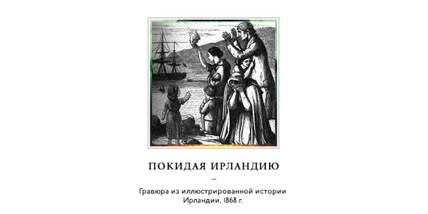 В середине XIX века ирландцев постигло новое несчастье. Всего за два года случились три неурожая картофеля, что привело к голоду, известному также как Великий голод. Британское правительство оказывало бедствующим небольшую помощь, нанимая разорившихся ирландцев (которые в подавляющем большинстве были арендаторами, а не собственниками земли) на общественные работы, но не отменило экспорт зерна из Ирландии (с зерном был полный порядок, голодным его хватило бы с лихвой). Сильнейший голод, эпидемии опасных болезней, разорение арендаторов — всё это привело к массовому бегству из страны. За пять лет население острова сократилось на 1.5 млн человек (из 8 млн.!). Часть ирландцев погибла от голода и болезней, остальные бежали в Америку. Это огромная цифра: представьте, что в современной России с 2011 года стало на 25–30 млн человек меньше.