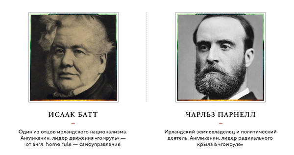 Эмигранты образовали крупную диаспору в США. Оставшиеся продолжили борьбу. В 70-е годы зародилось движение за ирландскую автономию, в русском переводе превратившееся в ужасно звучащее слово «гомруль» — от английского home rule, «самоуправление». Гомрулевцев вдохновлял пример Канады, за несколько лет до этого получившей автономию. Лидером движения был Исаак Батт — один из отцов ирландского национализма. Как и большинство образованных и богатых ирландцев, Батт исповедовал англиканство.