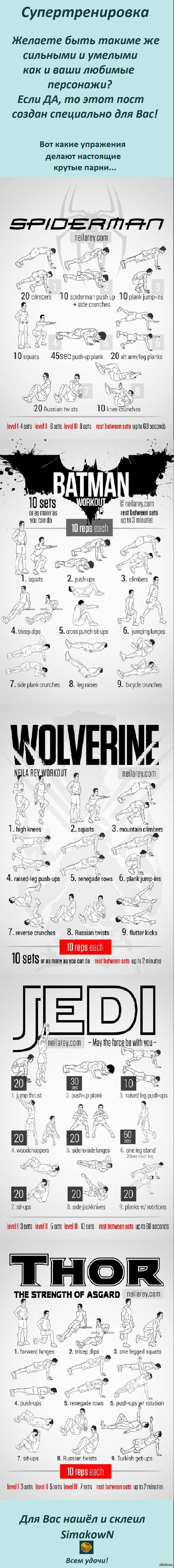 31 SimakowN 11 лет назад Супертренировка или как стать крутым парнем Показать полностью 1 [моё] Супергерои Спорт Тренировка Бэтмен Джедаи Человек-паук Тор Длиннопост