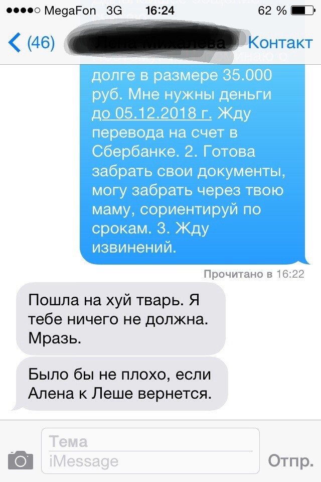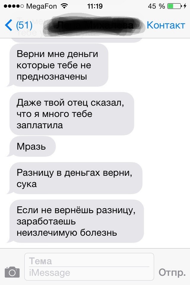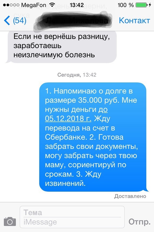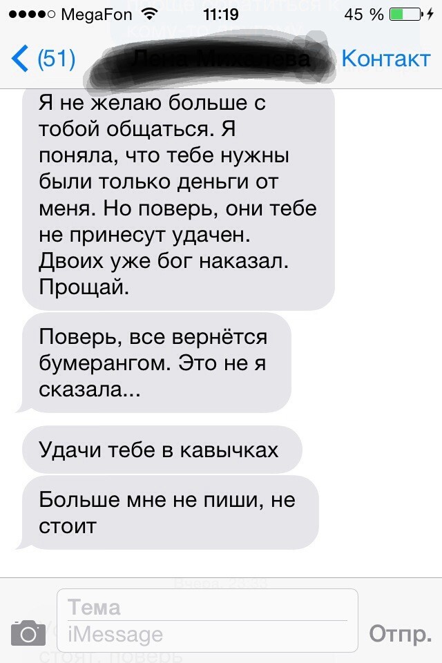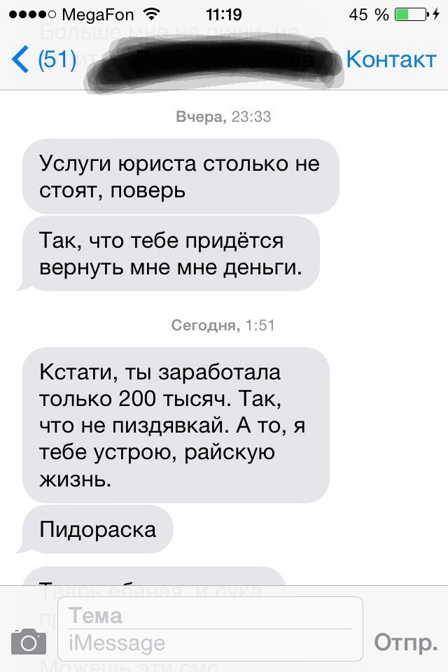 Нашла в сохраненках скрины переписки 2018 г. с бывшей клиенткой 38 лет, по совместительству двоюродной сестрой бывшего сожителя, по совместительству бывшей близкой приятельницей, у которой даже гуляла на первой свадьбе. Были знакомы около 30 лет. После смерти второго мужа дама обратилась ко мне за помощью с получением наследства, куда входили недвижка и страховые выплаты. Имелся еще один наследник и кредиты. Обговорили перечень услуг: взаимодействие с нотариусом, банками, страховыми, другим наследником. Срок: до полного разрешения всей ситуации. Оплата: 300.000 на руки после получения дамой денег. Результат: дама получила недвижимость и выплаты, закрыли 2 из 3 кредитов. На руки получила 265.000, 35.000 дама обещала выплатить чуть позже, так как ей на машинку не хватало. Однако, чуть позже вместо денег получила следующее: