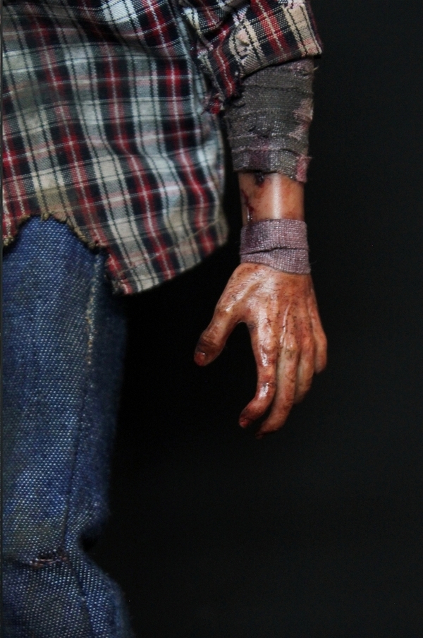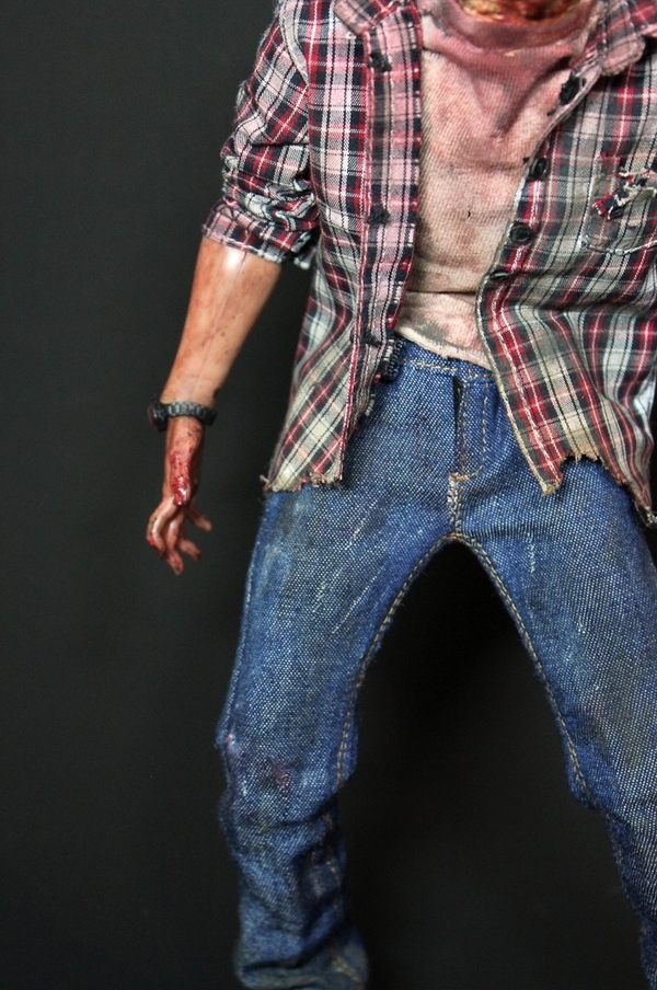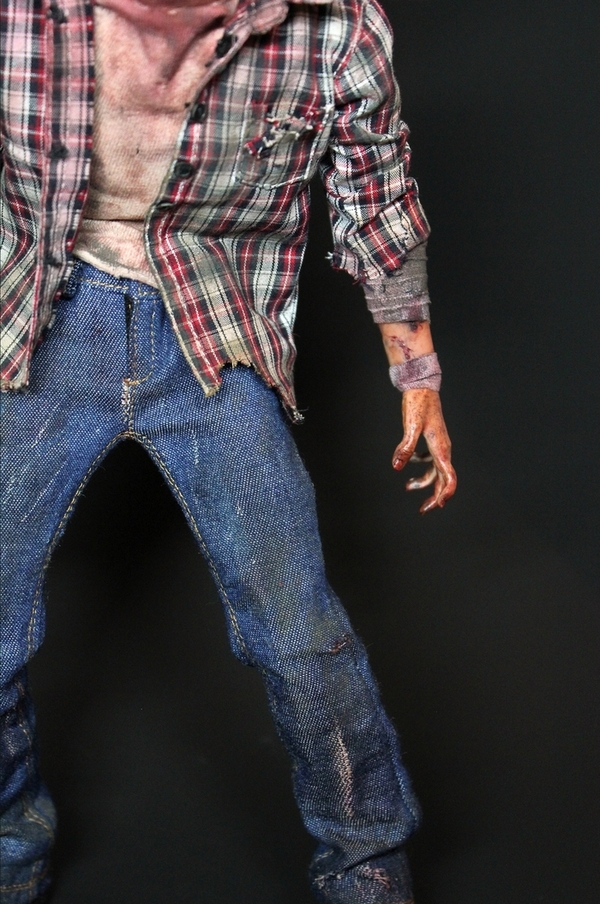 В данном случае проделанной работы было много, начиная с покраски скульпта и первого опыта работы с небольшим пучком волос (надеюсь их видно на фото), заканчивая покраской телойда и одежды. В целом результатом я доволен, насчёт одежды: изначально не планировал рвать её по максимуму, решил лишь слегка повредить и загрязнить.