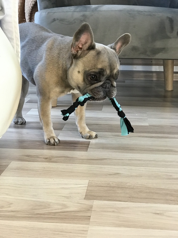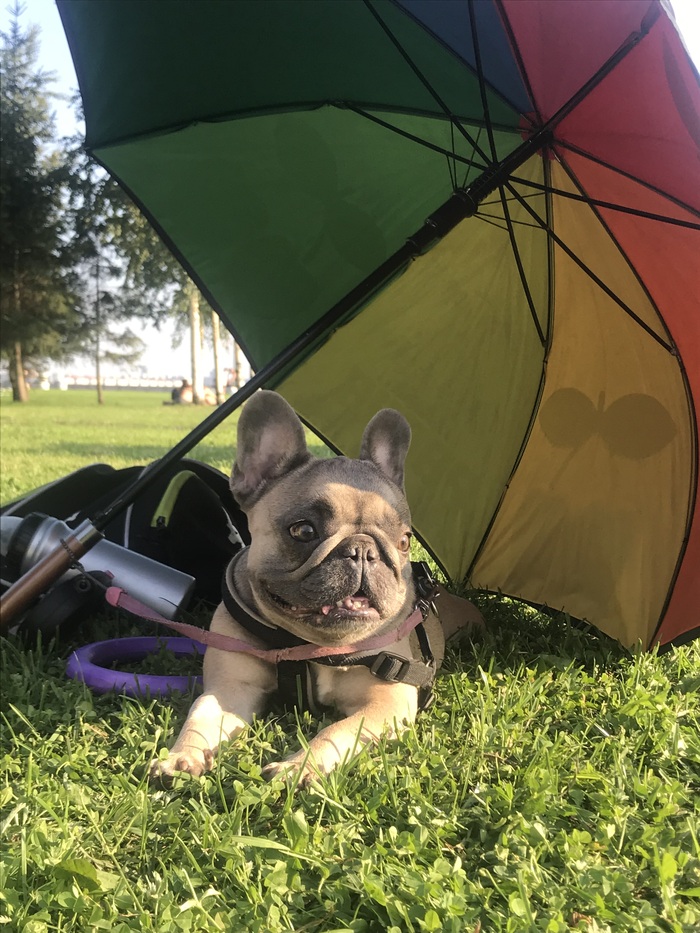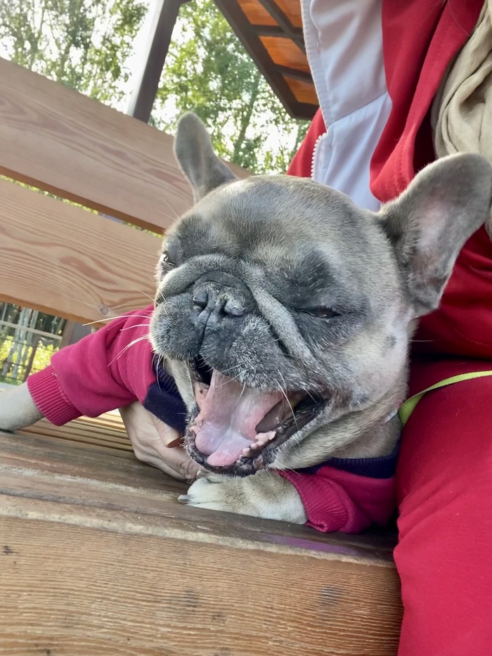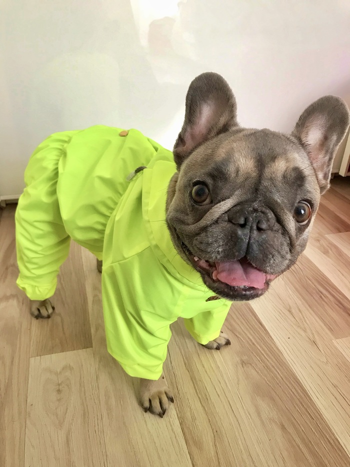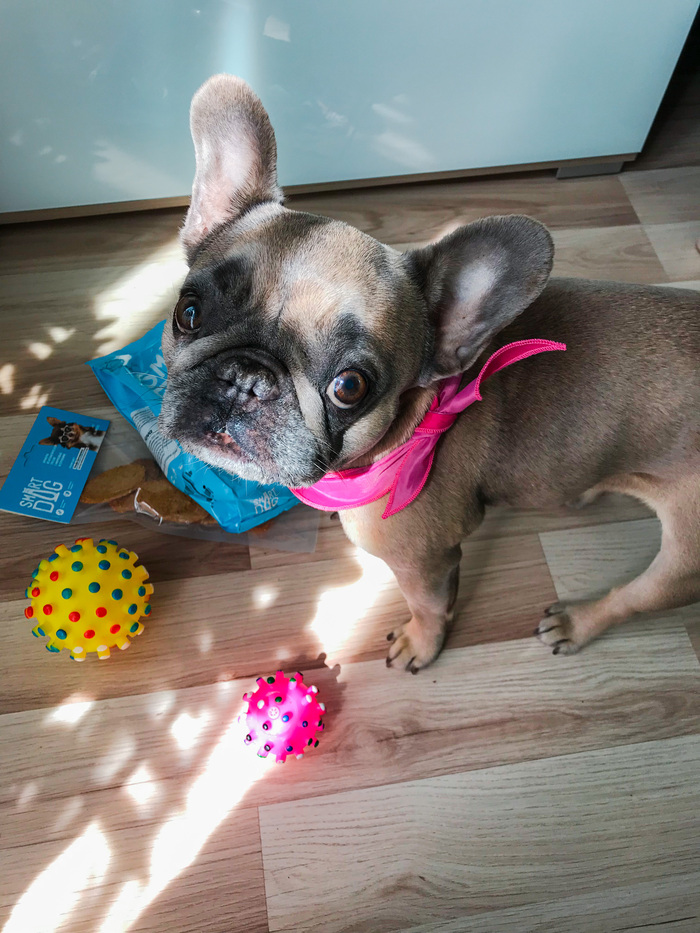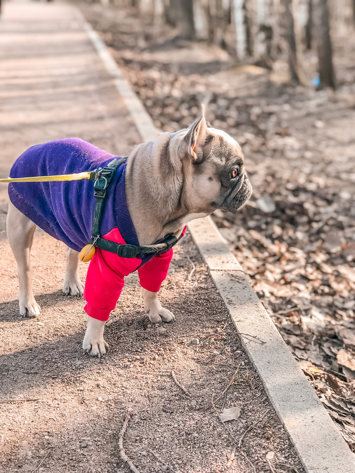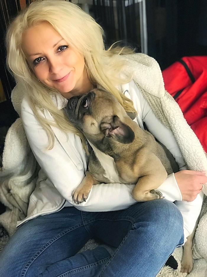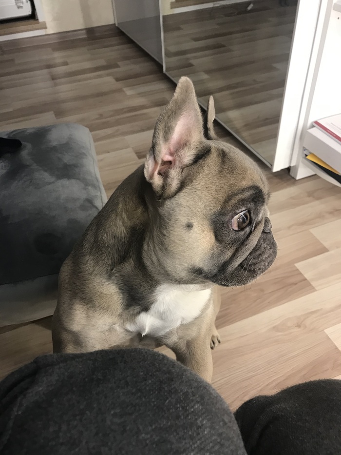 У нашей: изящный, палево-голубой окрас. Щенков не произвели на свет. Так как ветеринар обнаружил в сердце аномалию, с которой собака могла не перенести наркоз, который необходим при кесарево. Так как бульдог мини - сама бы не справилось с родами.
