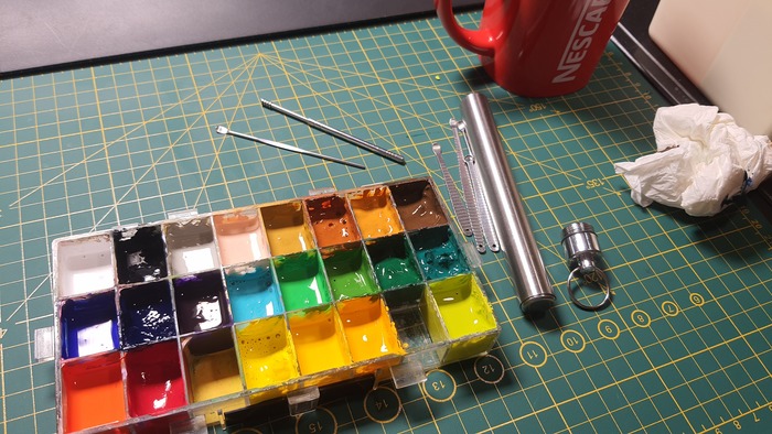 Делаем все аккуратно. Если краска перекинется через бортик, смешается с другой. Это будет фиаско. Хорошо промойте инструмент перед другой кюветой, тоже может смешаться краска. Не переборщите с горячей водой для кюветы, я немного перебрал в нескольких. Теперь оставлю с открытой крышкой, чтобы подсохло немного.