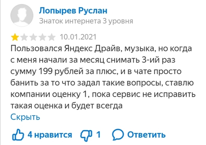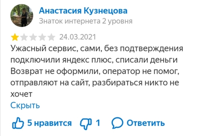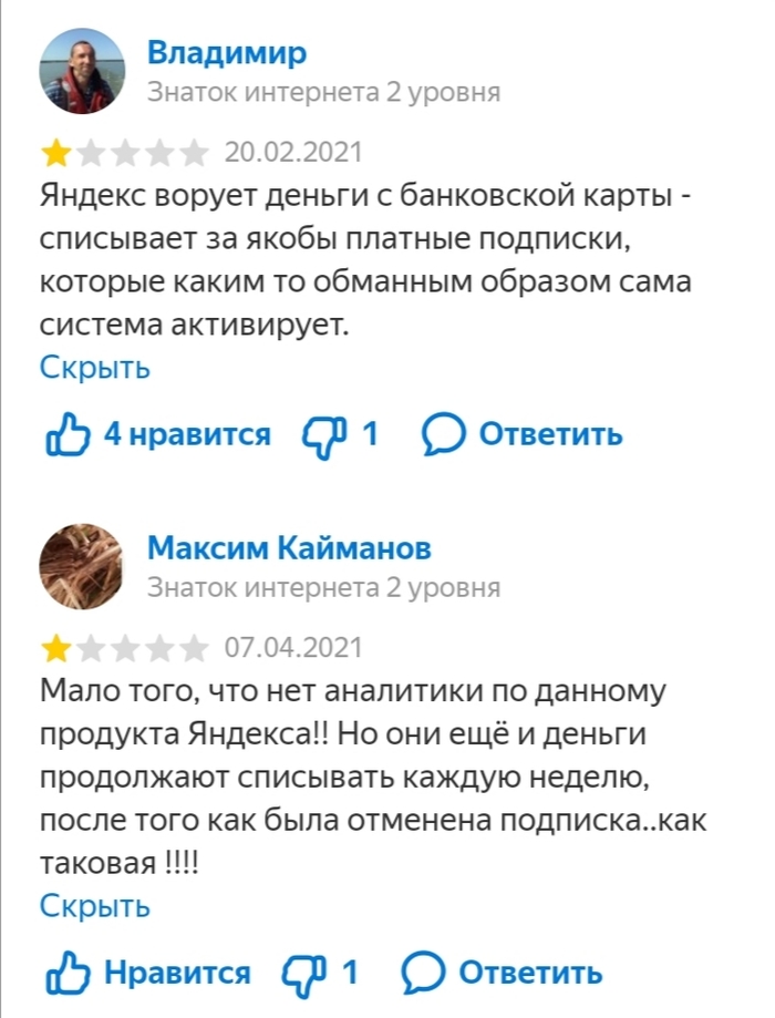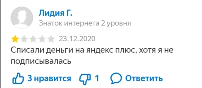 На все эти отзывы наткнулся на странице "Яндекс услуги". А всё началось с того, что мой друг спросил у меня: "Ты не подключал меня к Яндекс Плюсу?". Конечно нет.