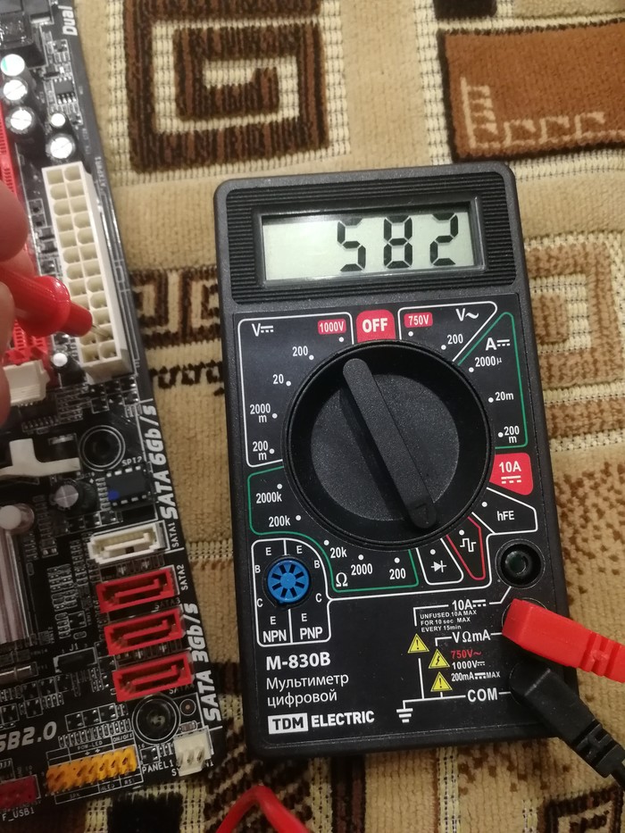 Не знаю зачем, но нашел распиновку колодки питания в гугле и решил измерить в режиме прозвонки сопротивление на ее контактах. Я правильно понимаю - в нормальной рабочей цепи сопротивление должно быть равному напряжению?