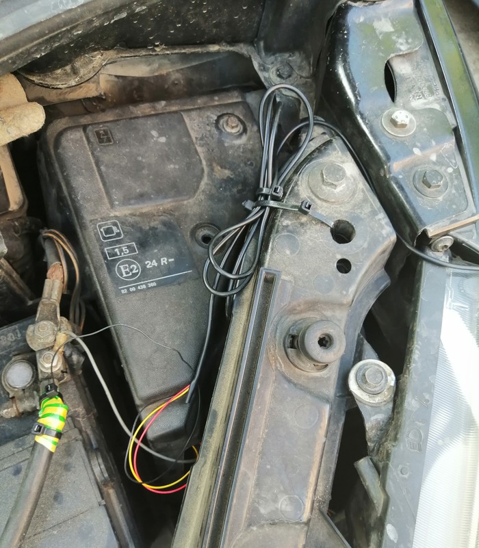 Дальше пришло время запитати это дело, решение было запитать на провод магнитолы, чтобы вместе с магнитолой включалися дхо, идея с треском провалилась, так как протянуть кабель в салон не представлялось возможным, из за, практически полностью, отсутствуещего пространства под капотом, пришлось искать другой вариант. Под капотом я нашёл один из блоков предохранителей, и давай гуглить к чему можно там подрубится, и нашёл, под капотом есть предохранитель в слоте 5F на 7.5а, не могу вспомнить для чего он требуется, но на 100% помню что дхо ему не повредят. Этот предохранитель это + который появляется после запуска движка. Подрубив к нему красный провод, а чёрный кинув на клему акамулятора, я перешёл к тестированию, дхо запускались вместе с двигателем, победа. Под капотом все выглядит так, провод пустил под фарой, жёлтый кидать на ближний свет было лень, потому я его не задействовал. Требуется в теории для того чтобы когда включается ближний свет, на него идёт ток и это отключает дхо, но мне просто лень было снимать аккумулятор чтобы добраться до фары(да да, чтобы сменить лампочки в сценике, надо снять аккумулятор.) дхо обошлись мне в 8злотых(~2€).