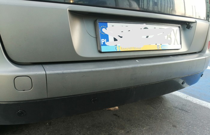 Установив камеру я понял что камеры не достаточно, и купил набор парктроников, тоже дешёвый, 35злотых(~8€). И тут начинается колхоз, поскольку дрели к которой можно присоединить насадку у меня нету, попробовал в ручную этой насадкой резать(так себе идея, только мозоль натер), решил делать дырки сверло по дереву 20", с наконечником который подходит к обычной отвертке с насадками, с последующим растачиванием дырок в ручную до нужного диаметра. Так я установил датчики парктроника, запитал я это дело как и камеру заднего вида на лампочку заднего хода(если для кого понадобится, для второго сценика это белый провод). Работает превосходно, результатом доволен.