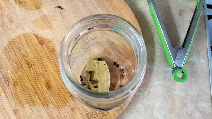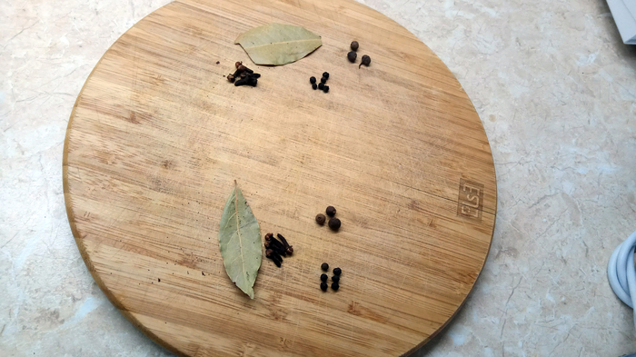 Закончили? Отлично, дальше будет проще. Переходим к специям. С моем случае это лавровый лист, перец горький, перец душистый, гвоздика. На фото - подготовленное количество на две пол литровые банки. С количеством, как и с самим специями, можно неограниченно экспериментировать - выбирайте на свой вкус. Но этот набор я считаю базовым.