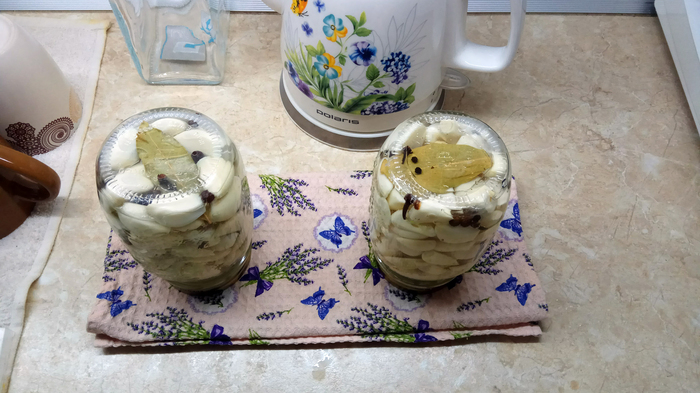 P.S. Я не химик, но подозреваю, что в процессе заливки чеснока маринадом эмульгируются некие эфирные вещества, которые могут окрасить готовый продукт в, скажем так, неожиданный цвет. Ни на вкусовых качествах, ни условиях хранения это никак не скажется, но фото этого самого окрасившегося чеснока я уберу в комментарии, чтобы не смущать начинающих кулинаров.