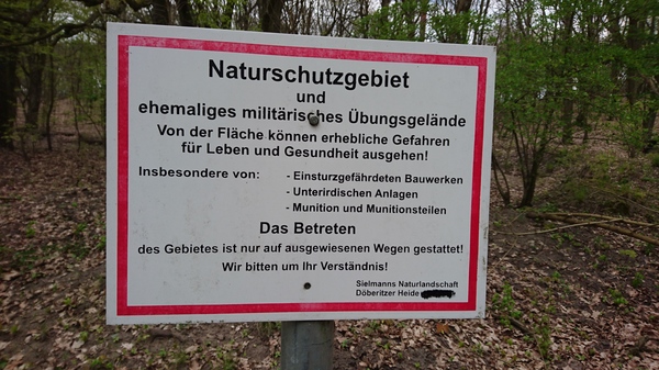 Надпись на табличке: "Бывший военный полигон. Область может представлять существенную опасность для жизни и здоровья.