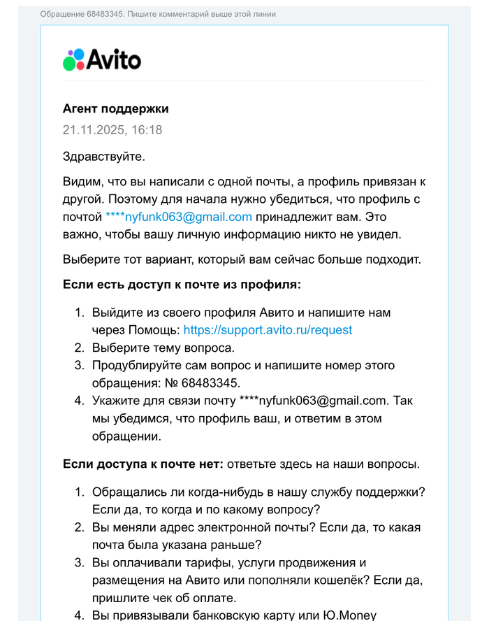 В октябре решили поехать с семьёй на новый год в Казань, забронил коттедж, внёс предоплату 31250р, пообщался с собственником и всё. Позавчера захожу в приложение а мне пишет что мой профиль заблокирован. Шта?! Тут есть момент - почта которую я привязал тогда в 2023 году давно и успешно мной забыта, поскольку скорее всего только для этой цели и создавалась. Сам ящик помню но пароль от него нет, и номер который был привязан - тот самый номер с которого я ушел купив другой номер в 23 году. Меня попросили отписать с того ящика, дали инструкцию (все скрины ниже) и так же инструкцию что указать если доступа к той почте нет. Я заполнил данные, и в течение суток получил ответ - мы всё проверили но не смогли убедиться что это вы. Как и нафига они тогда запрашивают эту информацию?!) Я приложил чеки внесения предоплат, а так же скрин недавней переписки с арендодателем коттеджа на Новый год, но меня все равно послали найух предложив создать новый аккаунт!) Поинтересовался что будет с моей предоплатой за коттедж, так как при оформлении было написано что бронь можно отменить до 16 декабря и деньги вернутся, после 16го переведутся собственнику, неизвестно что происходит с бронью и деньгами если профиль забанен. Предложил им либо вернуть на счёт с которого они были отправлены либо перевести собственнику коттеджа. И мне ответили - не можем проконсультировать вас. Еще раз: