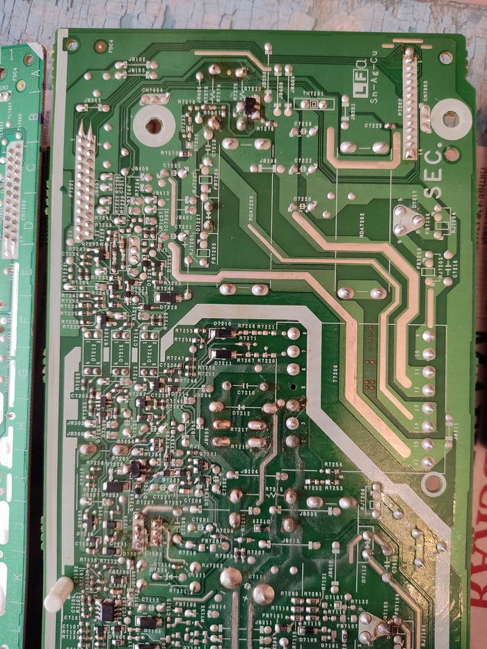 Сначала я проигнорировал 320 вольт на кондере C7112. И сразу перешёл к пункту 10 моего списка. Впаял отсутствующий варистор, заменил IC7201 и кондеры C7220, C7222, C7228, а также кондер C7227, потому как на нем должно быть 32 вольта с 3 ноги IC7201, но было всего лишь 12-15 вольт.