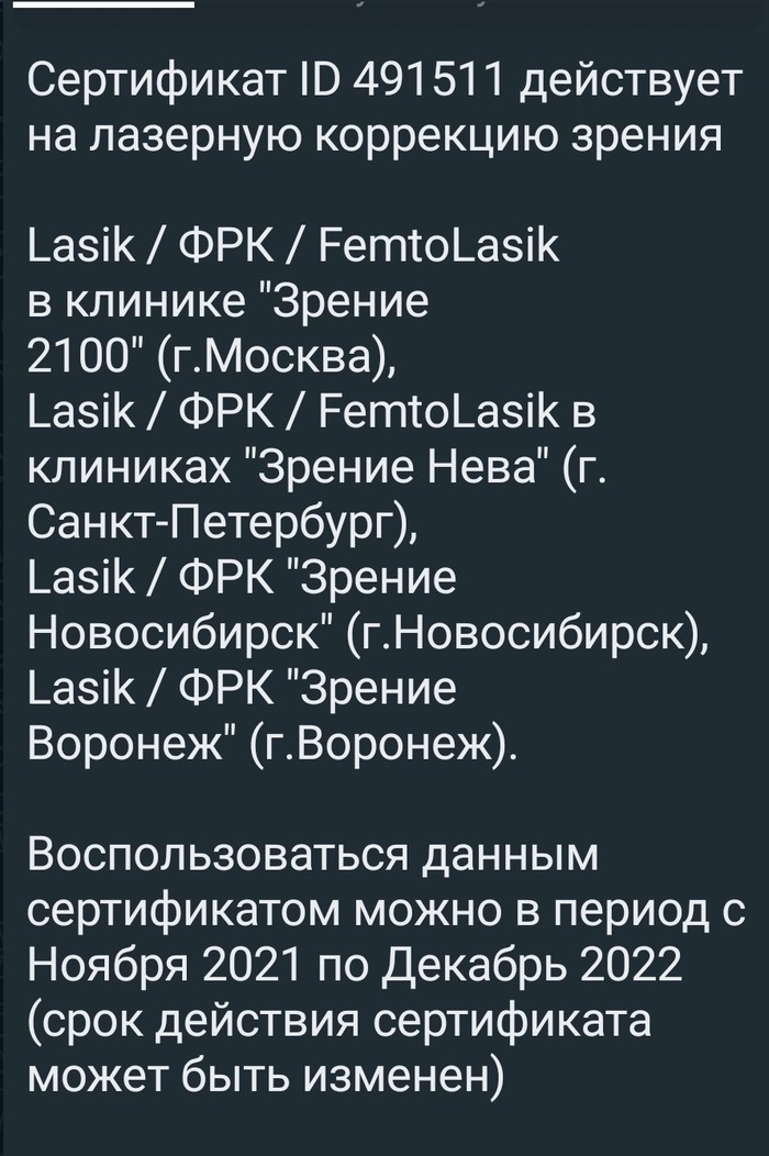 Если кто-нибудь хочет начать следующий год с новым зрением, то ловите сертификат на операцию. Сам сделал год назад. Безумно доволен.