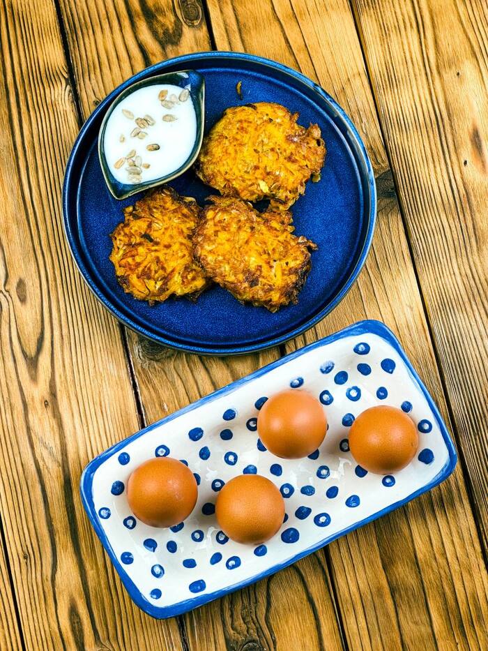 Добавляем к остальным ингредиентам яйцо и перемешиваем. Разогреваем скороду с маслом, выкладываем тесто на сковороду ложкой и немного приплющиваем. Жарим драники с обеих сторон до золотистой корочки. Поглощаем драники горячими со сметаной.