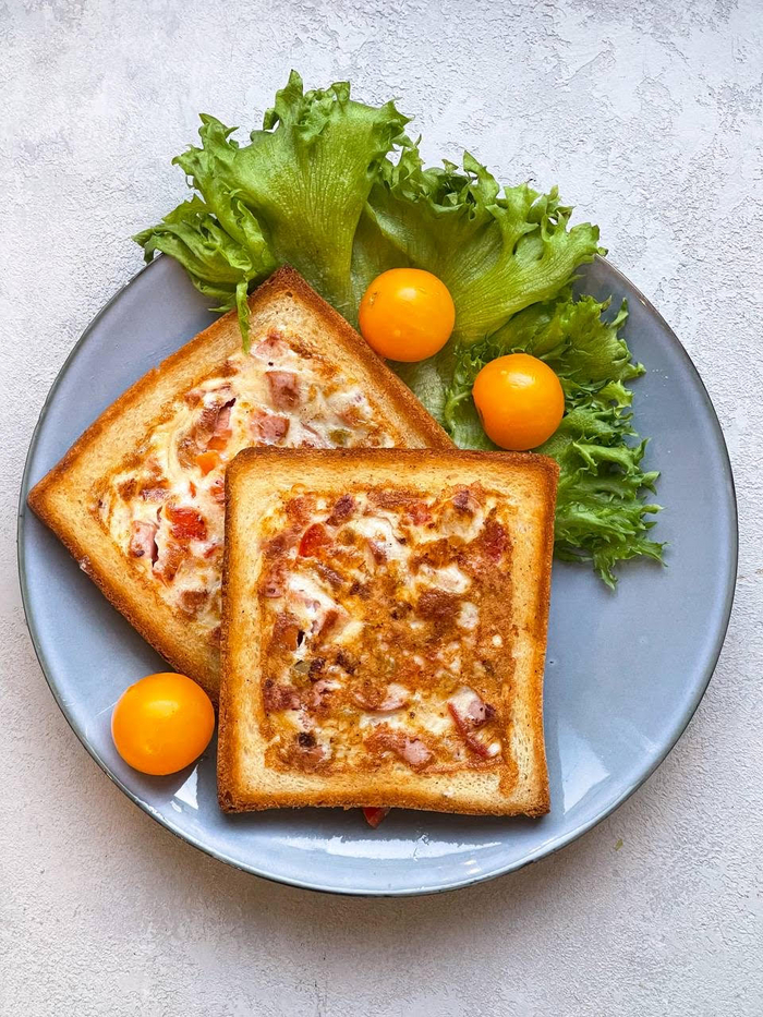 Болгарский перец, лук и ветчину нарезаем мелким кубиком. Сыр натираем на крупной тёрке. Яйца с солью взбиваем вилкой до однородности. Добавляем к яичной смеси перец, лук и ветчину. В хлебе вырезаем ножом большой квадрат так, чтобы получились рамка из корочки и квадрат из мякиша. Разогреваем сковороду, смазанную растительным маслом. Кладём хлебную рамку на сковороду, вливаем в неё яичную смесь. Сверху посыпаем сыром и прикрываем квадратом из мякиша, вдавливая его в рамку. Жарим в течение двух минут и переворачиваем тост. Готовим до золотистой корочки и подаём.
