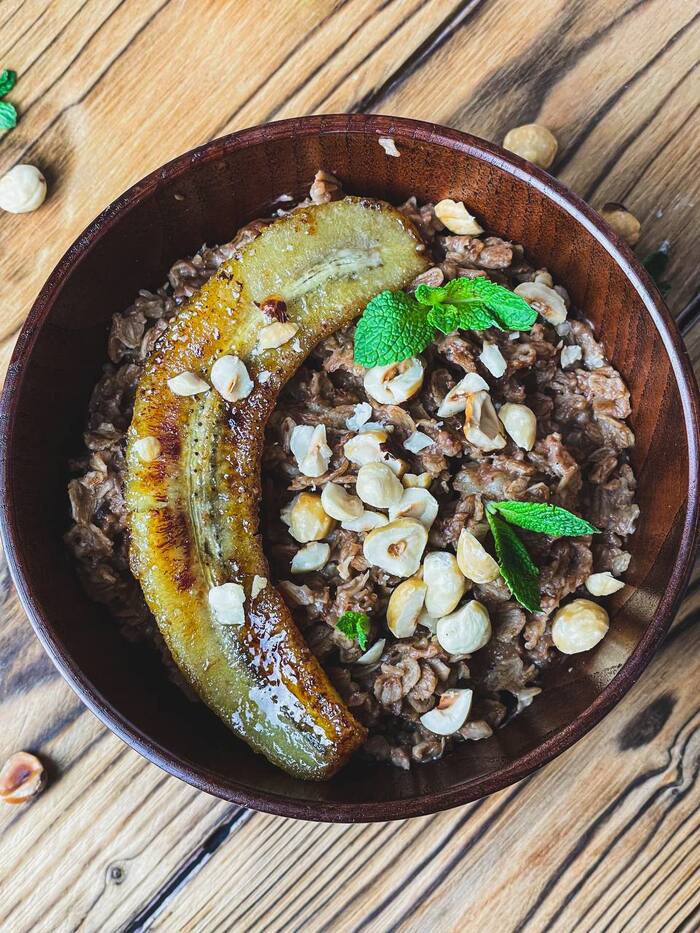 Кашу варим 5 минут, добавляем пюре из половины банана и варим ещё 5 минут. Выкладываем в глубокую миску кашу, сверху карамелизованный банан и посыпаем орехами.