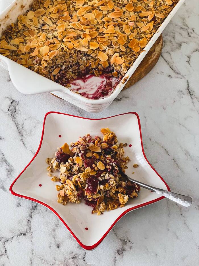 Выпекаем крамбл в разогретой духовке 30 минут. На последних минутах достаём крамбл, посыпаем миндальными лепестками и отправляем обратно в духовку. Поедаем как самостоятельное блюдо или дополняем шариком мороженого.