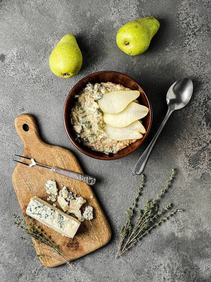Грецкий орех мелко крошим. Можно пакет с орехами прокатать пару раз скалкой, чтобы быстро их измельчить. Грушу режем тонкими пластинами. Выкладываем готовую кашу в тарелку, крошим сверху орехи, выкладываем ломтики груши, парочку кусочков горгонзолы и поглощаем свой завтрак.