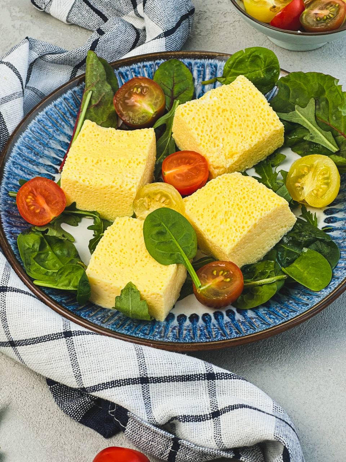Выкладываем сверху схватившегося желтка белковую пену, распределяем её равномерно лопаткой. Накрываем сковороду крышкой и готовим на небольшом огне 3-5 минут. Когда лопатка перестанет прилипать к белку, омлет готов. Аккуратно лопаткой делим омлет пополам и кладём одну половину сверху другой. Выкладываем омлет на тарелку. Подаём с овощами и зеленью. На фото вариант подачи порции на одного. Омлет я готовила в двух силиконовых круглых формочках, а потом выложила один на другой.