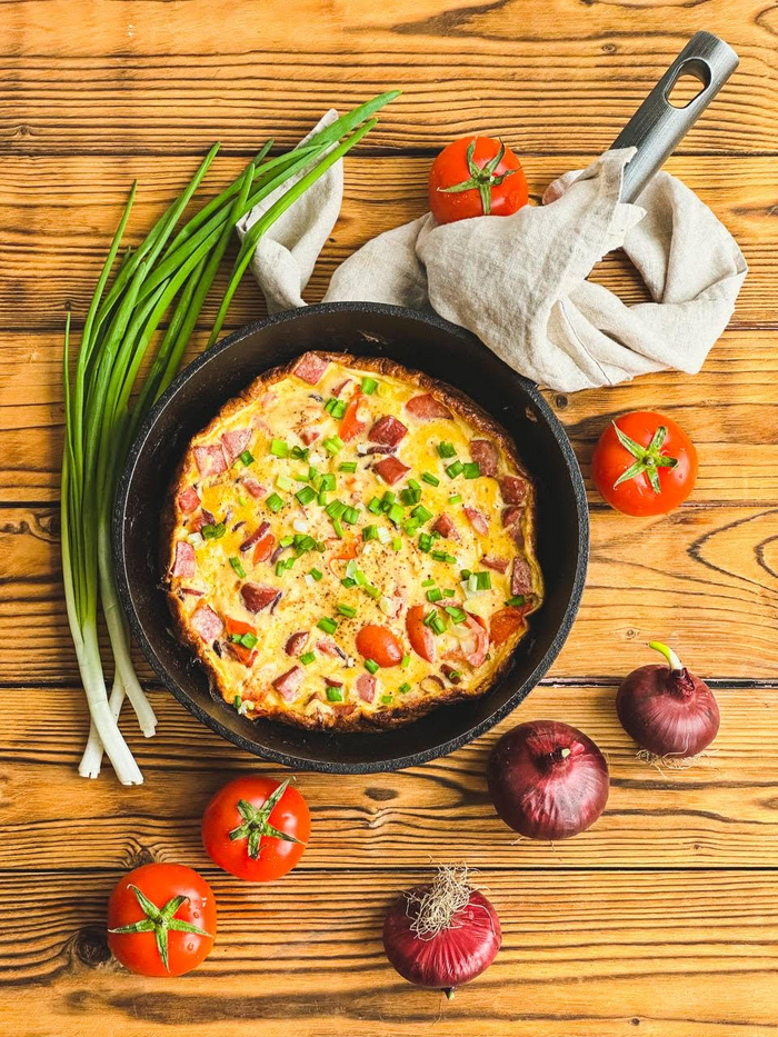 8. Деревенский омлет с колбасой, помидорами и красным луком