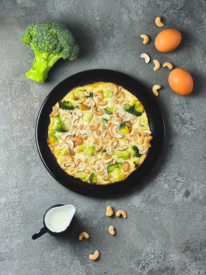 Разделяем брокколи на небольшие соцветия. Разогреваем сковороду с небольшим количеством растительного масла и обжариваем брокколи в течение 5 минут на среднем огне. Взбиваем вилкой яйца, молоко и соль. Орехи рубим на половинки. Вливаем яичную смесь к брокколи и жарим омлет под закрытой крышкой на медленном огне до готовности яиц. В конце добавляем орехи, жарим еще минуту и подаём.