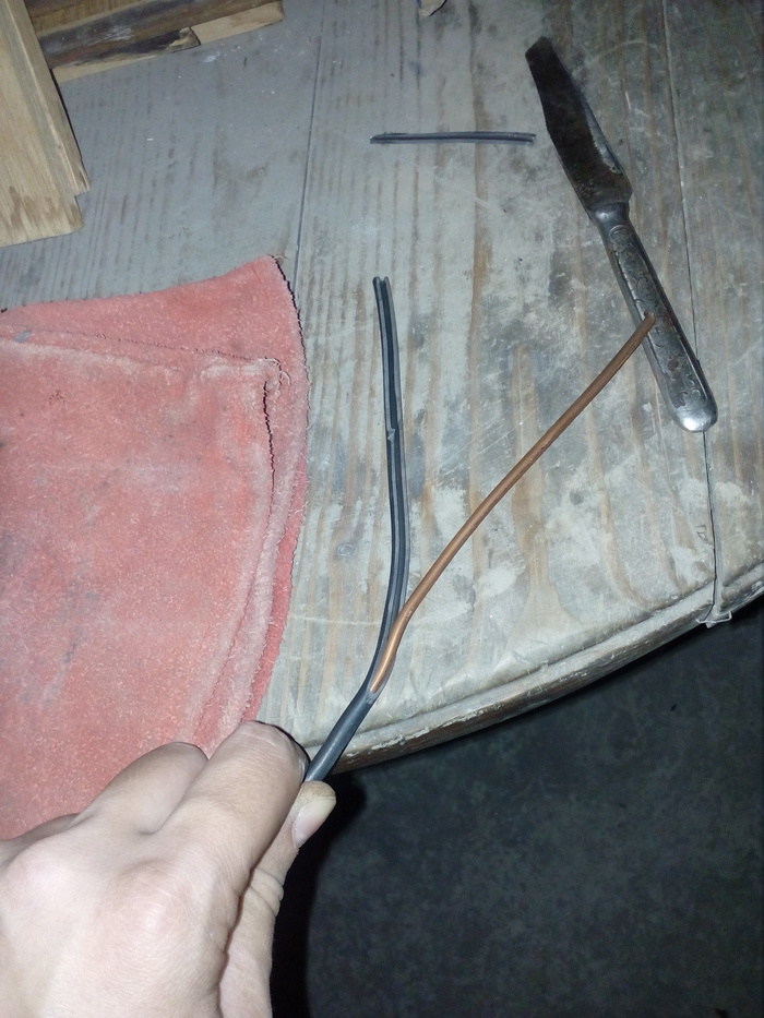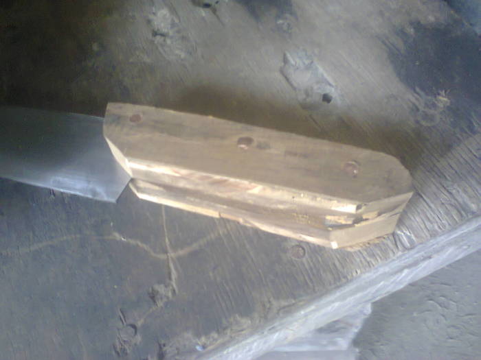 Заранее придав рукоятке форму со стороны клинка (лезвия) клепал медной проволокой диаметром 5мм. Под неё просверлил в рукоятке отверстия 4мм чтобы оч плотно заходило.
