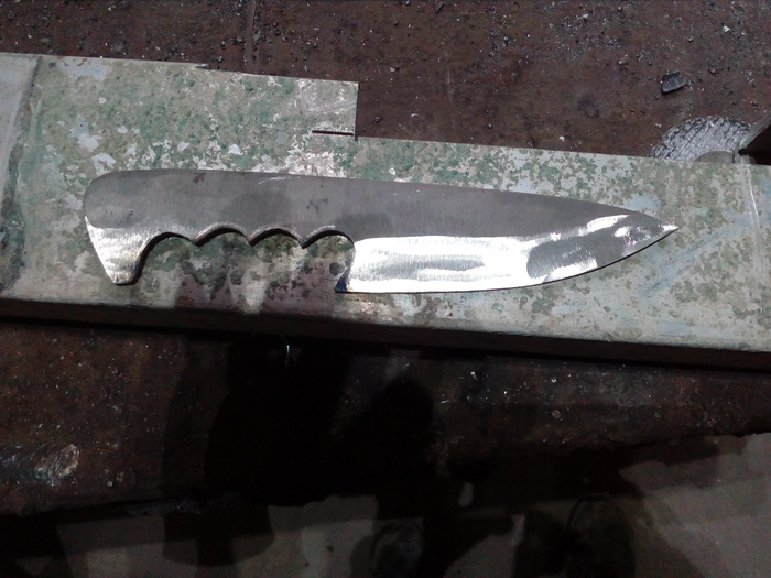 Этот нож из обоймы коленвального подшипника двигателя какого-то грузового авто. Калил в масле ( отработка ), потому что металл оч твёрдый чтобы не был слишком хрупким (как при закалке в воде) понятно что нужен ещё и отпуск, но с отпуском заморачиваться не стал ибо на работе не где.. а тащить домой в духовку как то не комильфо. Тем более хотел удивить супругу сразу готовым результатом.