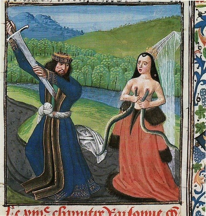 29. Рыцарь и Смерть. Рыцарь, облачённый в тяжёлые латы, замахивается на Смерть своим мечом. Та же, одетая более просто, бедно и легко, протыкает бок «недоступного» Рыцаря его же копьём. Более того, это не просто копьё, а его турнирная разновидность, что может указывать, что рыцарь погиб не на поле боя, а на потеху другим или пытаясь потешить собственное самолюбие в рыцарских поединках.