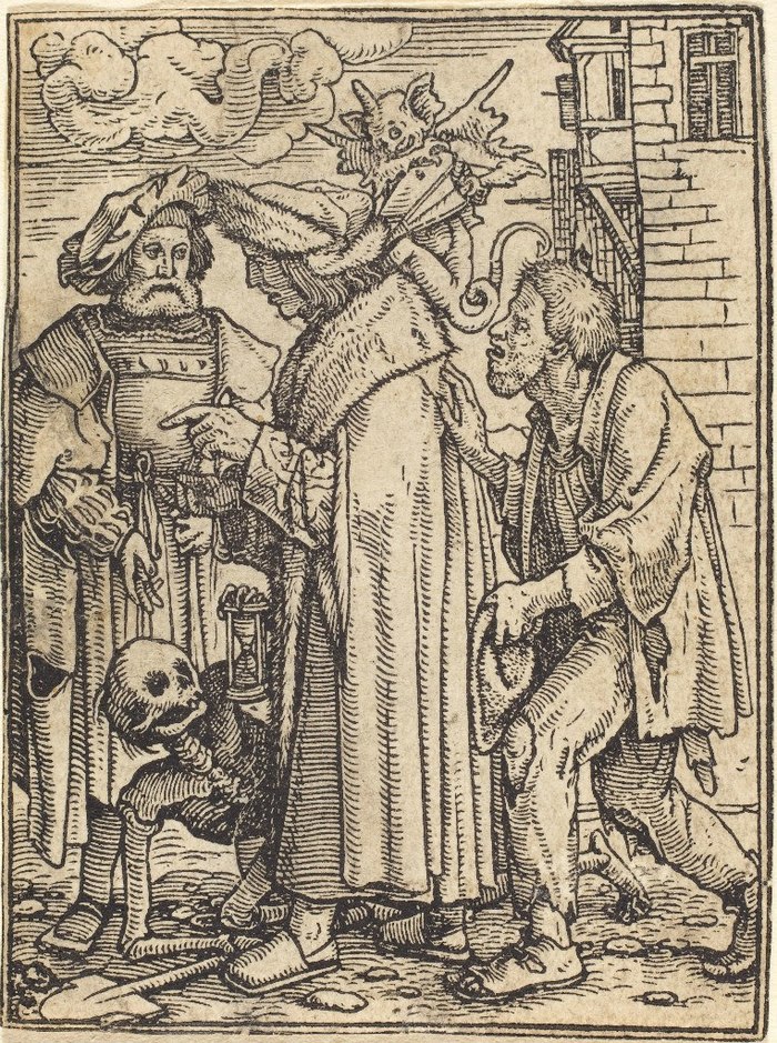 19. Герцог и Смерть. В Немецких землях Герцог являлся наместником каких-либо земель, был крупным землевладельцем. На гравюре Герцог предпочитает не обращать внимание на бедную женщину с ребёнком, просящую подаяние, а общаться лишь с высокопоставленными особами. Смерть, упираясь рукой ему в грудь, напоминает ему, что надо помнить о всех, кто живёт на его землях. Любопытно, что одна из колонн замка (левый верхний угол) подменена на песочные часы; это может служить символом того, что власть и её крепость Герцога лишь временна, ведь всё здание может рухнуть, если убрать колонны.