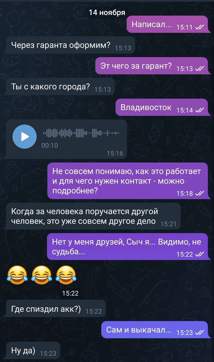 Всем добрый день. Наткнулся в чате игры на сообщение о покупке аккаунта, заинтересовался. "Покупатель" спросил скрины, задал пару вопросов, попросил перейти в телегу, т.к. "Вацап тупит". Разговор был недолгий (в голосовом просьба отправить ФИО и номер телефона любого человека, который меня знает). Окончание с лёгкими нотками провокации, как это обычно делают "безопасники вашего банка". Кто Холмс посильнее меня - подскажите, в чём подвох? Тег "Мошенничество" пока не ставлю, номер "инвестора" тоже пока не указываю, вдруг паранойя пока лишняя... Откупная от минусов в конце поста - зовут Рокси. XD