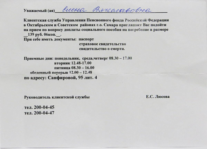 В Самаре умершую пенсионерку Пенсионный фонд России пригласил за пособием на свои похороны