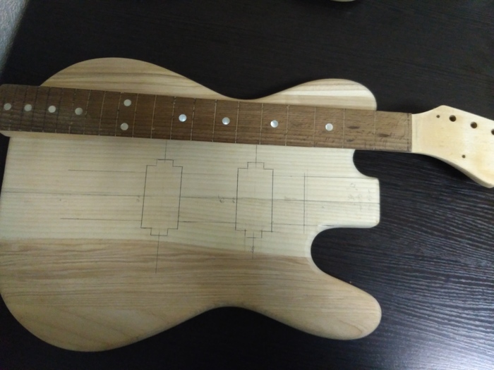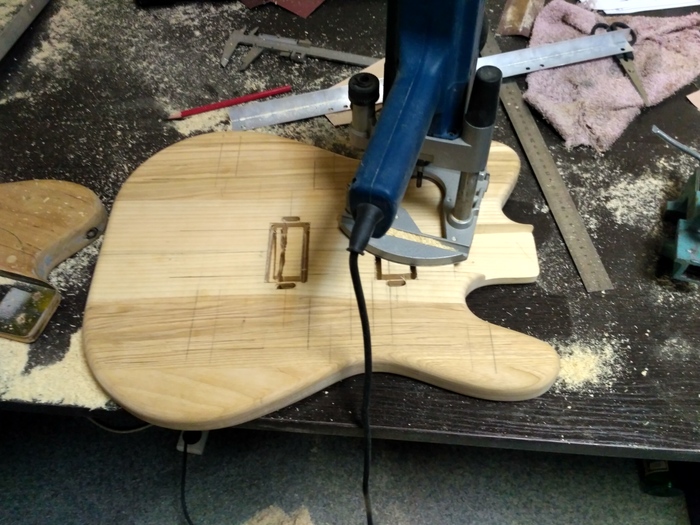 Вооружившись фрезером и линейкой подготовил деку. Лучше бы на этом этапе я всё таки мозгами вооружался. Косанул с положением бриджевого датчика, сняв мерки с другой гитары не посчитав разницу в грифе. Дальше будет видно как я устранял этот косяк.