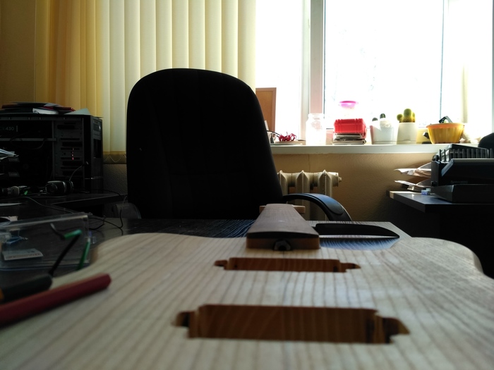 Поискав по городу хороших столяров заказал у них щит из ясеня. Отдал старую деку как образец. Неожиданно для меня они не просто щит сделали, но ещё и форму деки отфрезеровали. Параллельно выдрал старые лады и начал шкурить гриф.