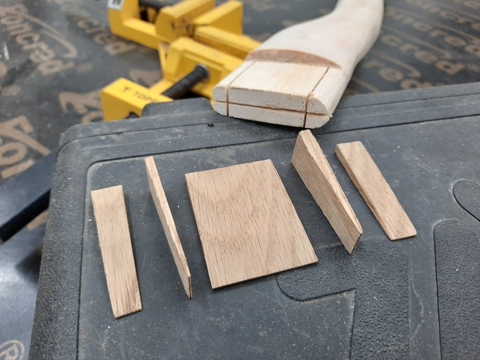 Клины теми же пилами выпилены из дуба и доведены до состояния "клин" на лентошлифовальном. Можно было и в ручную рашпилем/напильником, но тиски были заняты другим проектом. Да и быстрее и проще, на ленте то.