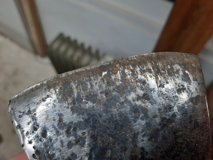 3. Лезвие съедено коррозией. Вопросов то тут нет, вещь старинная, ямы от корозии добавляют аутентичности, окей. Но обработано оно только механически, болгаркой, никаким травлением ржавчины и не пахло, следовательно после первой же поездки на природу топор станет весь рыжий.