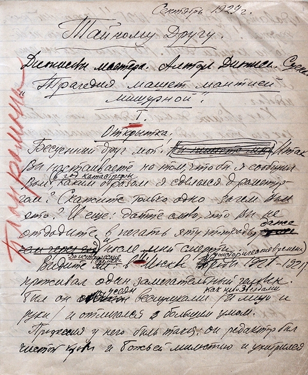 Бесценный друг мой! <зачеркнуто: Вы пишете мне> Итак, Вы настаиваете на том, чтобы я сообщил Вам <в год катастрофы>, каким образом я сделался драматургом? Скажите только одно — зачем Вам это? И еще: дайте слово, что Вы не отдадите в печать эту тетрадь <зачеркнуто: ранее чем через год> даже и после моей смерти.